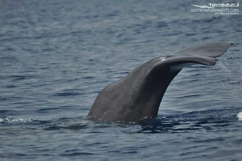 At first we sighted a mother with a tiny calf next to her. They spend a lot of time on the surface and the calf was drinking for a while just below the mom. Eventually they dived, but then we encountered another mom with her small calf! So it was a kindergarden of whales today. The adults all showed their mighty flukes for another deep dive into the abyssal zone!