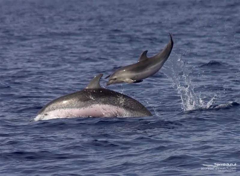 Today we had a dolphin day! The Atlantic Spotted and Common dolphins were there both in the morning and afternoon, and they were showing off their flexible moves and jumps like we would expect from a dolphin. Within a second they can change their position with 180°. These days most groups that we are seeing are nursery groups, as summer time brings warm water, which is very favorable for the young ones to be born into.
