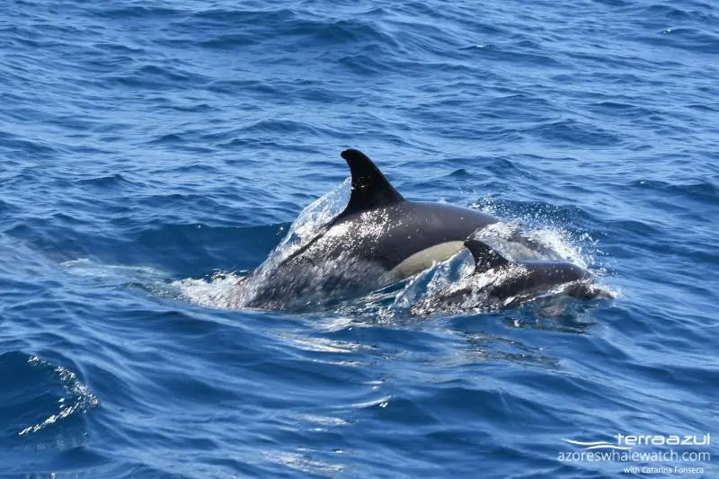 At some point our lookout André directed us to see some… false killer whales! 😀 It was already a while we didn’t see them, as they tend to appear in the Azores on a random basis throughout the spring and summer. We went in the area where André saw them and waited, when all of the sudden we could hear a blow behind us and there it was: a curious false killer whale which was checking the boat engine. It kept surfacing behind and to the side of the boat, as well as swimming belly up underneath it. false killer whales, which are large members of the dolphin family, are not shy as the Risso’s dolphins and are known to often bow-ride and being inquisitive. We stayed with this individual, or better the individual stayed with us until it decided there was nothing else to check about the boat 😀
