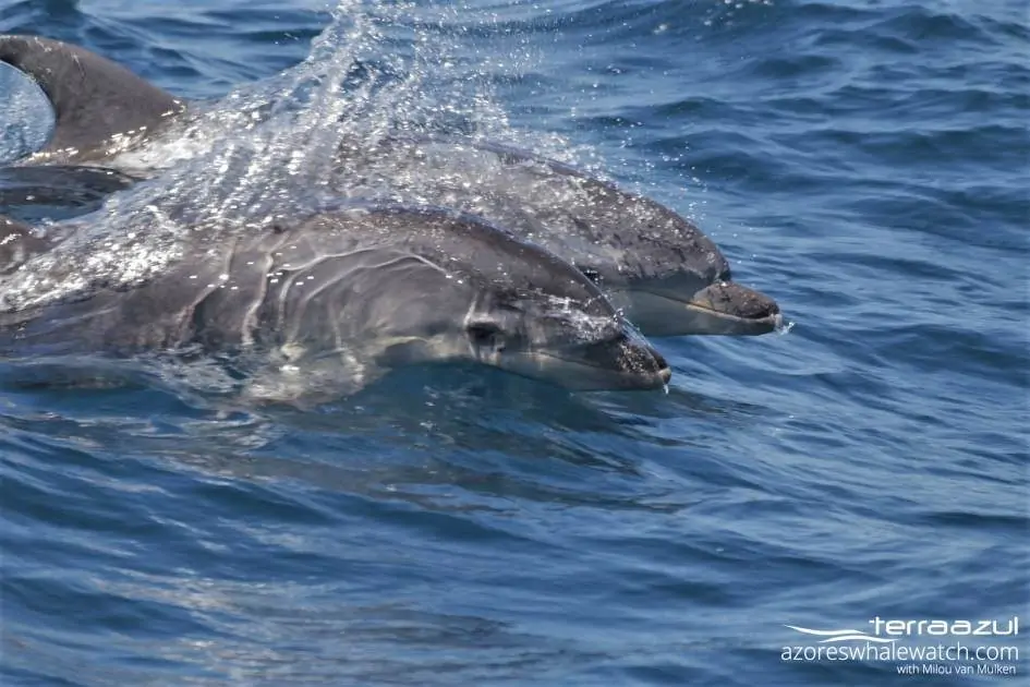 We started with the Common Dolphins close to Ponta Delgada. It was a group of young dolphins, we had a lot of juveniles in there. Then we went more to the East side of the island. The sea was a bit more choppy because of the wind. There, we saw a small group of Bottlenose dolphins. They were spending more time under the water, it seemed that they were traveling.