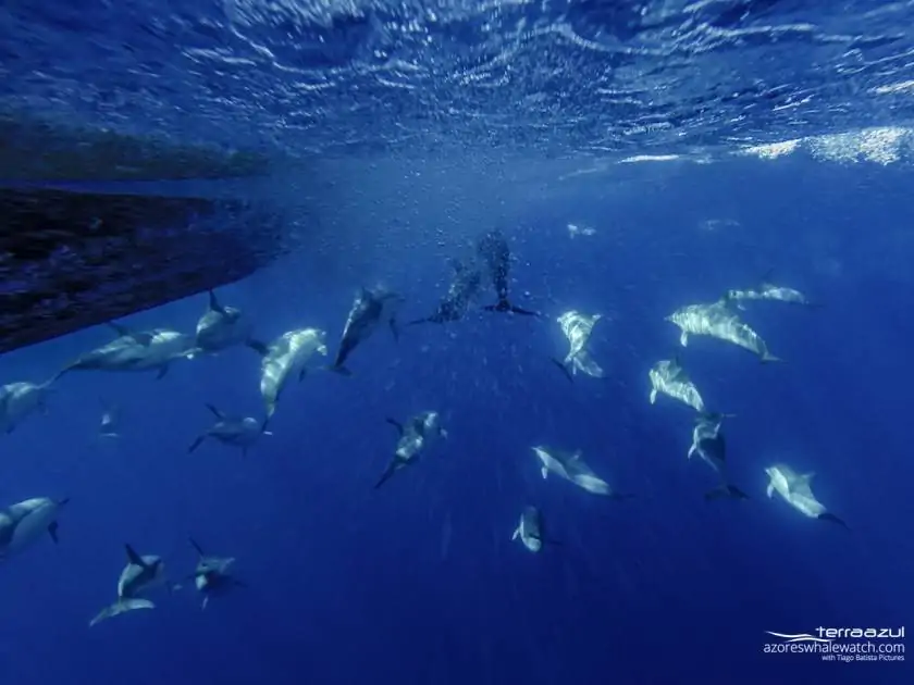 On today’s morning tour, we saw two resident species. The firt one was the Bottlenose Dolphin. The group was not to big, maybe about 15 or 20 individuals and they were very relaxed. They were swimming very quietly. Then our lookout saw another species, the Common Dolphins. We arrived there and the group was much bigger, more active and they had some babies and juveniles jumping around. They were foraging, so we put the hidrophone under the water and we could hear the whistles and other vocalizations, it was really nice. Close to the dolphins we found a Loggerhead Turtle swimming around, which was a nice way to end our tour!