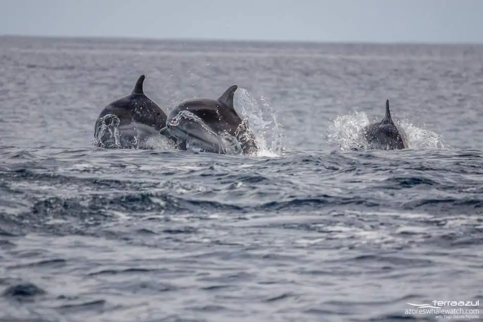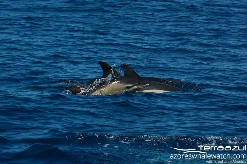 Today the animals decided to let us wait a bit before showing up, but when they appeared what a show! We first saw a very large group of striped dolphins to the far east of the island. striped dolphins are usually very fast and even when they leap out of the water is not easy to see their typical stripe crossing their flanks and giving the name to the species. Our second encounter was with another large group of dolphins, this time the common. There were many calves synchronised with their mothers when jumping and chasing their prey while busy feeding.