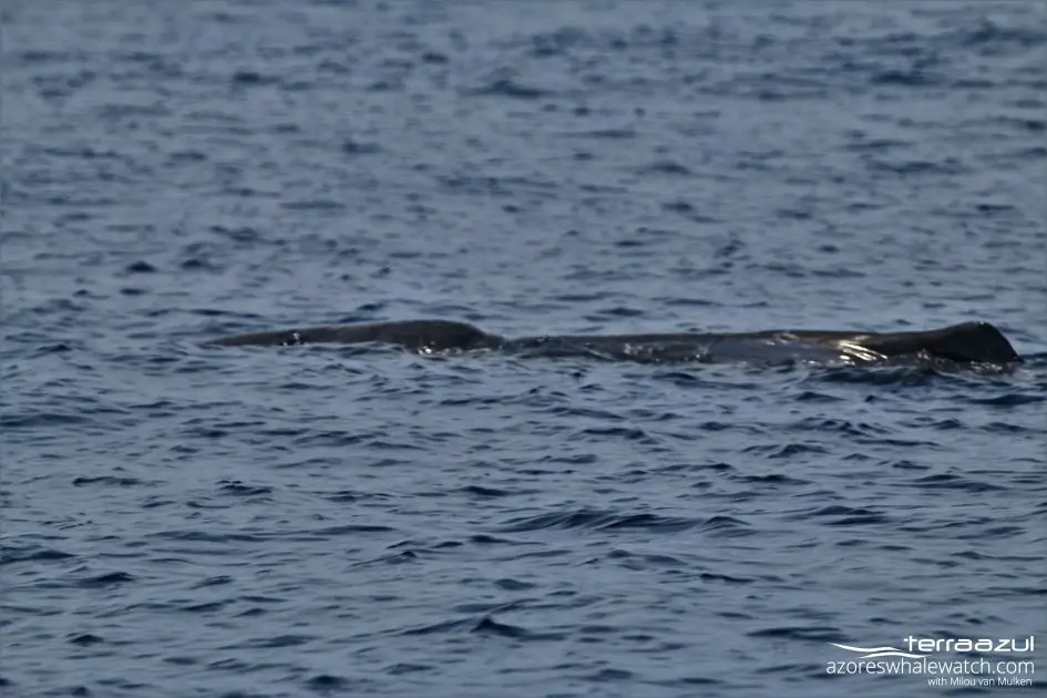 When we left the bottlenose dolphins, and started our way towards a “Sperm whale area” we found two lovely loggerhead turtles, the cherries on the cake! 😀 Well, the best layer of the cake was yet to come, a small group of Sperm whale, including a a large male, was resting at the surface. We could observe them from distance until the male started to swim in our direction and eventually passed next to our boat showing its big prominent head and the massive body. After several blows they took a deep dive.