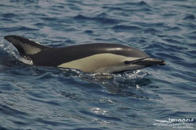 Common Dolphin (Delphinus delphis) swimming close to the boat with good visibility of the yellowish flanks