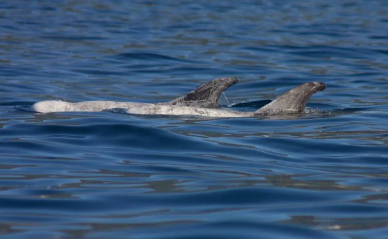 Today we had two trips one in the morning and one in the afternoon and in both occasions we encountered dolphins. In the morning our lookout Filipe found a very nice group of Risso’s dolphins. Usually elusive, these large dolphins today were very calm and allowed us to stay in their company for a little while.