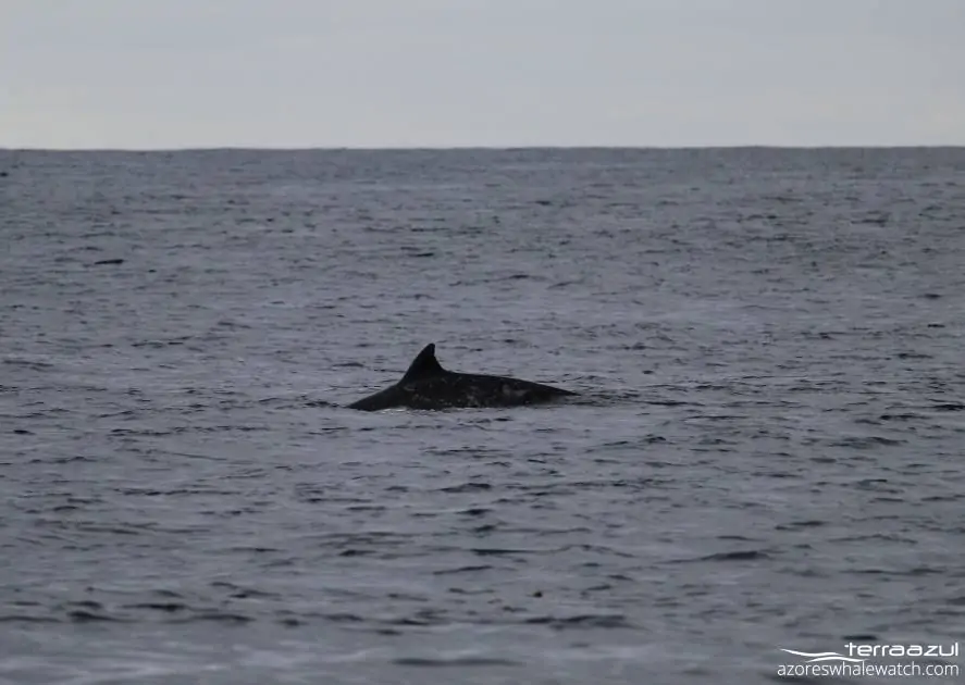 Encounters with beaked whales generally do not last long and our skipper Tiago was fast enough to capture the dorsal fin of a large adult male present in the group. The fin presented a large notch and two smaller nicks. These features allow us to compare this individual with other five individuals previously photographed in Sao Miguel waters. We found no matches and the picture will be stored as a “new” individual in MONICET database. Hopefully this adult male of Blainville’s Beaked Whale will be photographed again in the Azores archipelago, giving us some more information about the local distribution of this poorly known whale species.