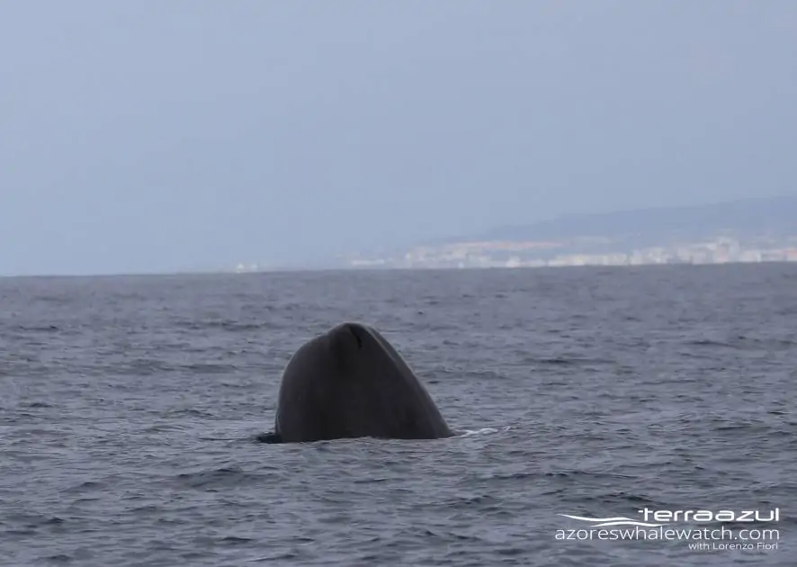 Sperm Whales (Physeter macrocephalus) are the largest of the toothed whales. They have a massive, blunt-ended head that can take almost 1/3 of their total body lenght. We had a very good sight on the Sperm Whale’s head as one of them was vertically in the water column.