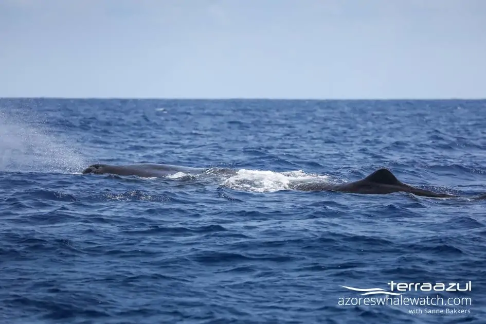 We left the Common Dolphins and set out in the direction of the Sperm Whale zone. As we cruised against the wind and waves, the Atlantic Ocean took us on a fun rollercoaster ride. At the moment we arrived in the Sperm Whale zone, we learned that the Sperm Whale in question was a large male travelling close to the surface and it was making regular shallow (non-feeding) dives. Our two zodiacs were not the only ones there to see this whale, so we observed several surfacings from this beautiful male and then left the area to respect his time and space.