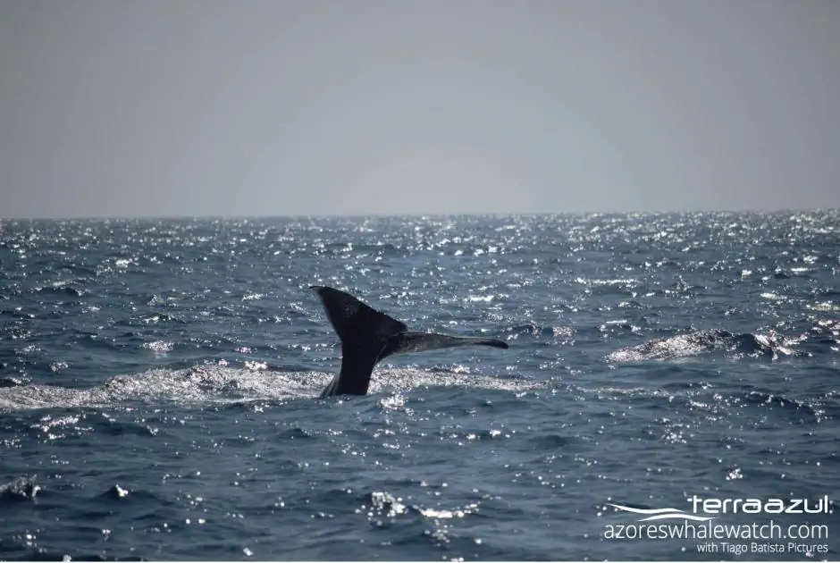 We spotted a Sperm Whale calf. After a few minutes the mother Sperm Whale also appeared and stayed very close. At birth Sperm Whales are about 4 to 5 meters and lactation is 19 to 42 months. Females, juveniles and calves live in groups. We saw more blows, so there were other Sperm Whales around too.