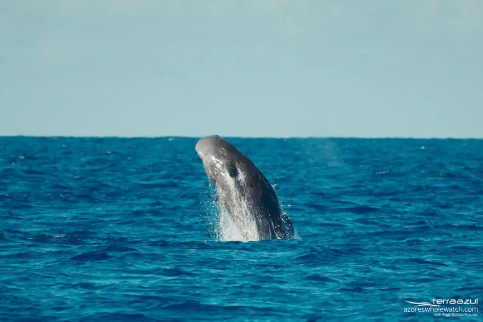 But the baby that was along with his mother, was jumping so much! Actually that is how our lookout, Filipe sighted him or her from the coast, due to the splashes that it was making, gotta remember that a newborn Sperm whale can weigh 1 ton at birth.