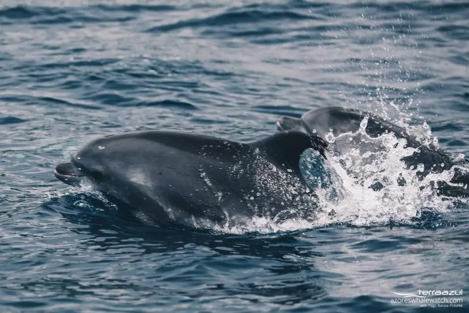 After that, we continued our tour and found a big pod of Bottlenose Dolphins (Tursiops truncatus) counting around 60 individuals. Part of the pod was made out of juveniles while there was also some very big adult specimens. Being less curious than the coastal breed, they came surprisingly close to us, riding the waves along our boat.