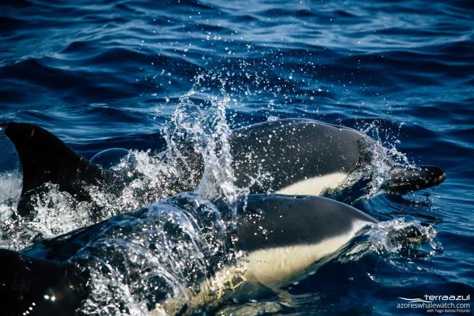 Guests, guide and skipper were looking over the ocean in order to locate the animal. Due to the white caps everyone was helping out. we sailed afterwards to calmer waters were a pod of common dolphins were socialising.
