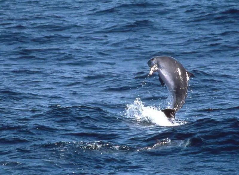 The Pigmy Sperm Whale is bigger, with a length between 2.7-3.4 meters , the dorsal fin is falcate and tiny and positioned more on the back of the body. The teeth are positioned on the lower jaw.