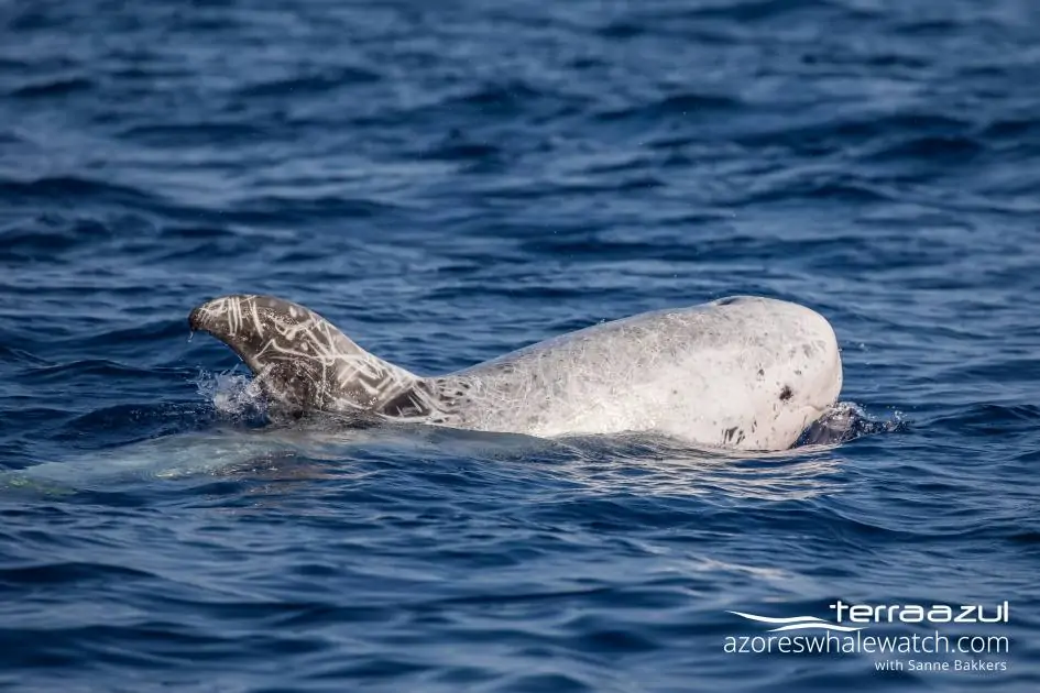 Risso’s Dolphins are known to be deep divers and can stay underwater for around 30 minutes before coming back at the surface to breath. Sometimes flukes raising can be seen previous to a deep dive. During foraging, confrontations with squids can also provide some additionnal scarring to the body.