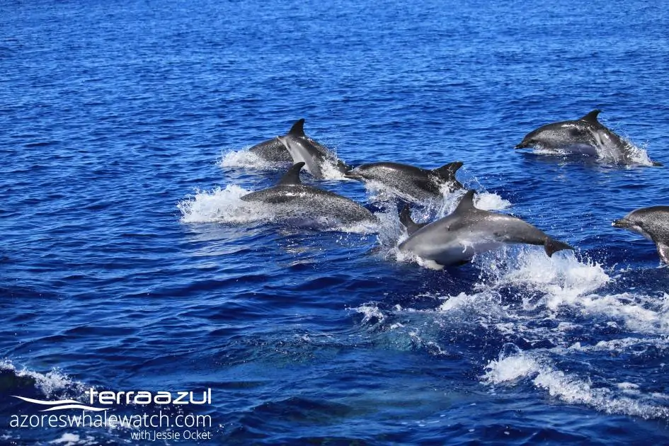 We first encounter a very curious group of Atlantic Spotted Dolphins (Stenella frontalis). We could see a lot of spotty adults bowriding with us.