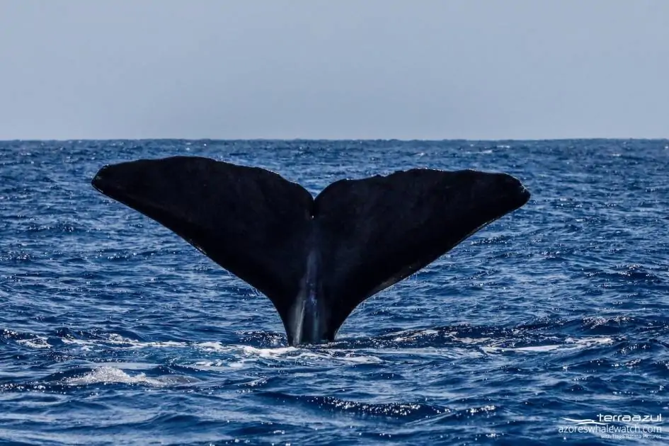 Sperm Whale (Physeter macrocephalus) fluking close by Terra Azul boat
