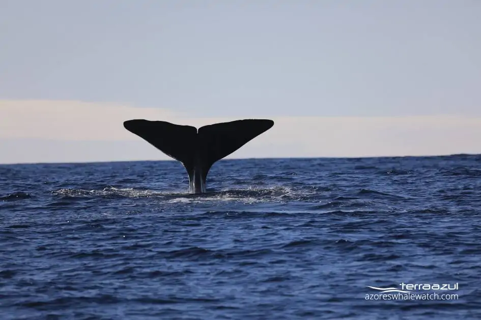 We navigated 14 miles out of the western part of the island in order to arrive and observe the massive resident Azorean male known to us as “C1”. This incredibly large Sperm Whale (Physeter macrocephalus) is not only impressive in size but it’s fluke when it rises out of the water, in order to return into the depths of the dark Atlantic Ocean, is breathtaking. Here for you to enjoy the most beautiful GIF of the year created after our tour this morning: is no other than our C1 male going down under. Isn’t technology awesome ?