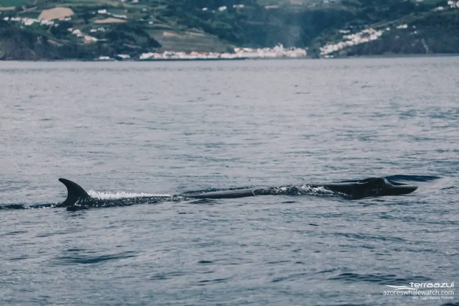 A different blow caught our attention today. The dark silhouette of a pointy dorsal fin does not lie: A Sei Whale (Balaenoptera borealis), the first sighted this year, was slowly cruising in front of Ribeira Quente.