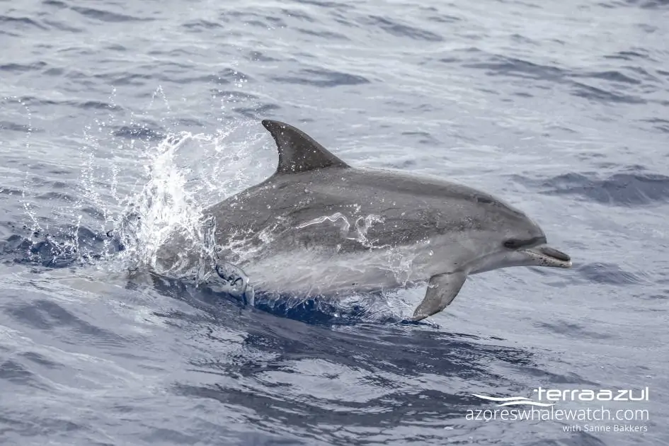 Our lookout Nicole first led us to a nursery group of Atlantic spotted dolphins (Stenella frontalis). We were surrounded by tens and tens of mother-calf pairs, travelling across the wind-swept waters several miles off São Miguel’s south coast.