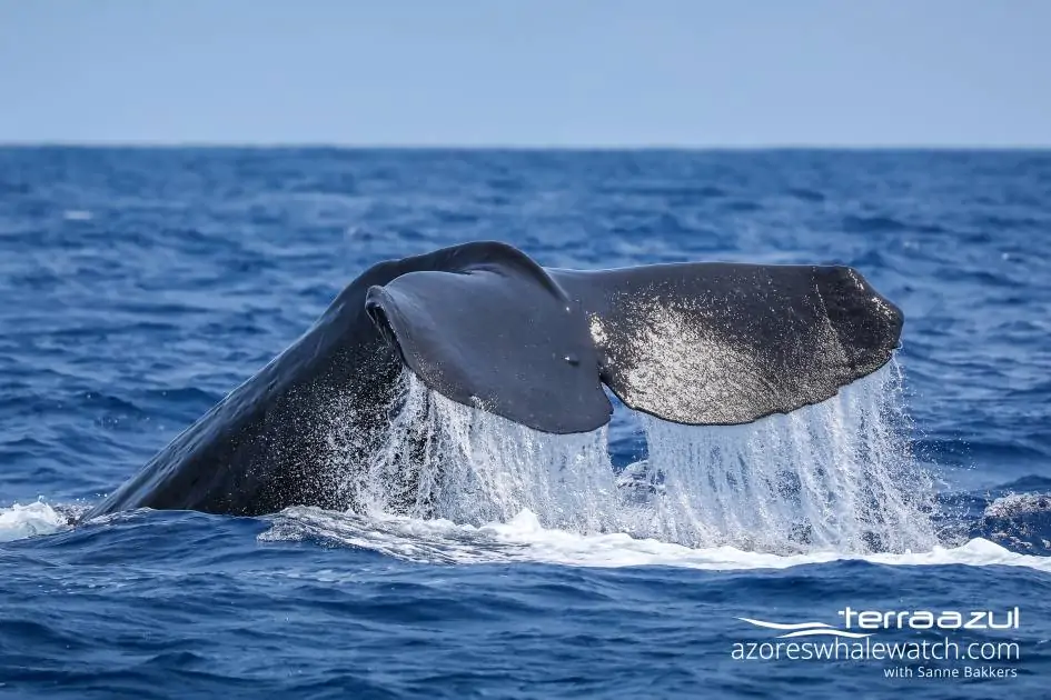 Male sperm whales spend a great deal of their lives in the colder, more Arctic waters of the North Atlantic Ocean. From time to time they migrate to the lower latitudes of the mid-Atlantic in search of females. In the afternoon, one of three sperm whales allowed us a closer look. After resting on the surface for several minutes, he suddenly arched his back and lifted his large tail high up into the air. An impressive moment that will be engraved in our memories for a long time!