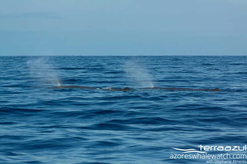 We sighted a family of about 6 or 7 Sperm Whales, first travelling a little bit, then soializing and then diving with two of them giving us the chance to see their beautiful flukes!