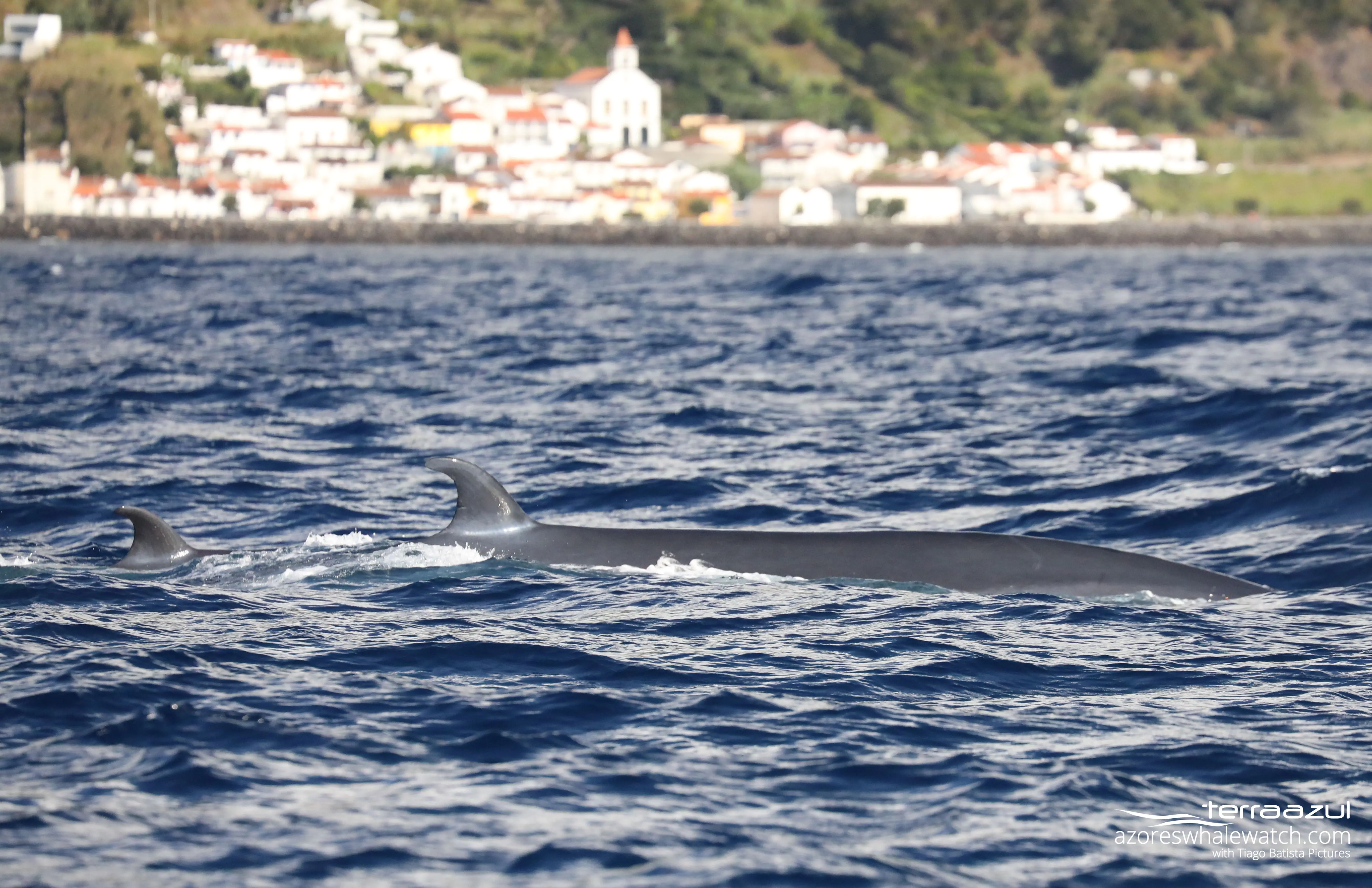 What we thought it was an isolate sighting, turned up to the first of a long (we hope!) series. Yes, I am talking about Bryde’s Whales (Balaenoptera edeni) which today we encountered again but this time it was a mother with her calf! The pair was just a off the shore of Ribeira Quente, as you can appreciate by the picture. Bryde’s Whales generally never leave tropical and subtropical warm waters, to the extent that they are considered a “tropical” whale. Well, it happens that we are experiencing a quite tropical weather here in São Miguel, both in terms of atmospheric humidity and water temperatures.