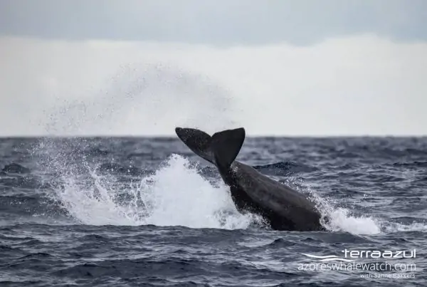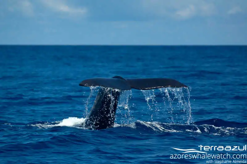 The food of Sperm whales mainly consists of squid. They tend to take very deep dives to a maximum of 3000m deep! Here in the Azores, Sperm whales usually dive for about 40 minutes and to depth of about 500-1000m.