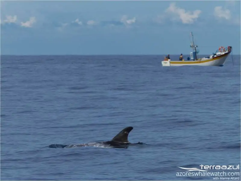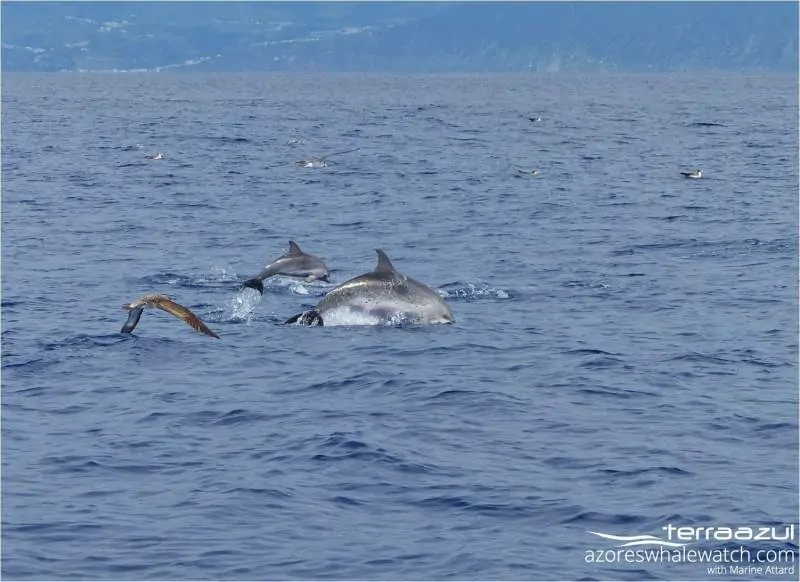 As we were far from the coast, 17 miles, we were almost sure to cross the way of another kind of life before to go around Ilhéu… Atlantic spotted dolphins were of course around! We met a huge and beautiful group composed by minimum 200 individuals, adults, juveniles and of course new fresh born babies 🙂 They were travelling, surrounded by Cory’s shearwaters, probably they all smelt fish no far from there.