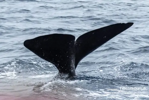 We introduced the hydrophone in the water in order to listen if Sperm whales Physeter macrocephalus where around….Nothing no clicks. We navigated further out to the East, and we decided to try again… sudendly “Click, click , click ” we could hear more than one individual. We spotted the blow and indeed after 35 minutes of waiting we saw them, two adults and a baby. A triple dive with three flukes going down, one after the other.