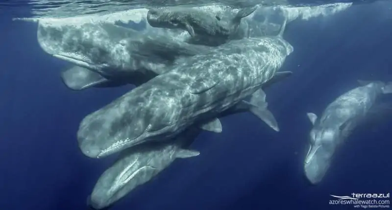 A matriarchal pod of Sperm Whales (Physeter macrocephalus). A calf is visible in the middle of adults and juveniles individuals.