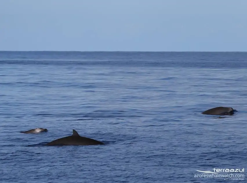 Calm Ocean conditions were ideal also to look for more elusive species at sea. Blainville’s Beaked Whales (Mesoplodon densirostris) appeared in a small group of around four individuals just a few miles off Vila Franca do Campo shores. With our great surprise, we even stumbled across a pod of True’s Beaked Whales (Mesoplodon mirus) that we managed to identify with some tech aid 😉 This beaked whale species is very rarely observed and we felt incredibly lucky to spend some time with a group including a little calf with its mother.
